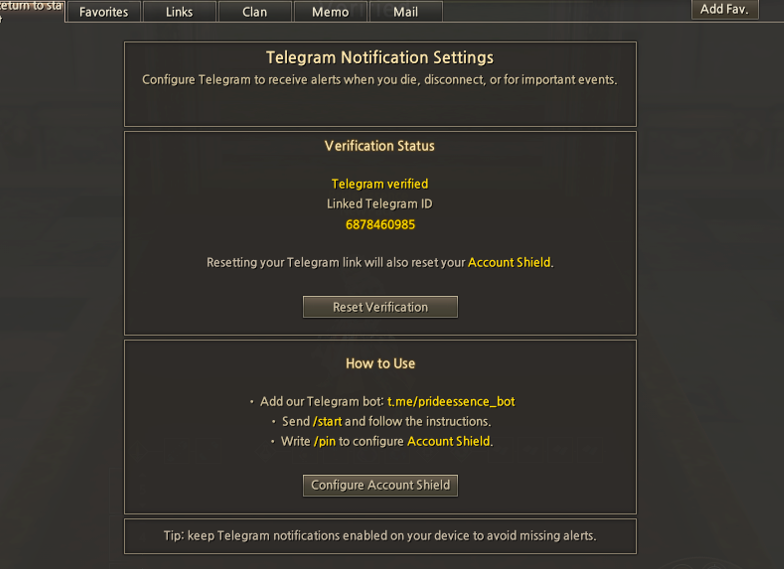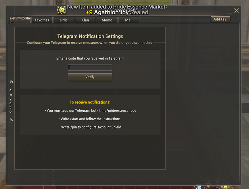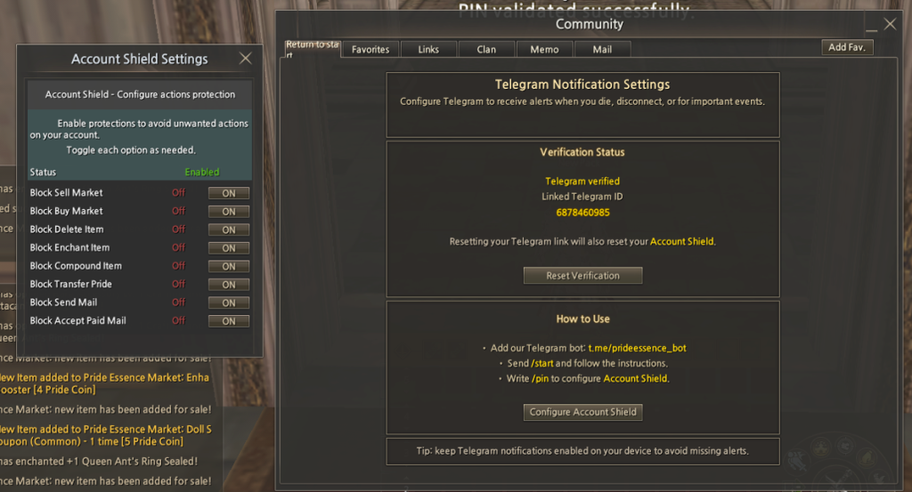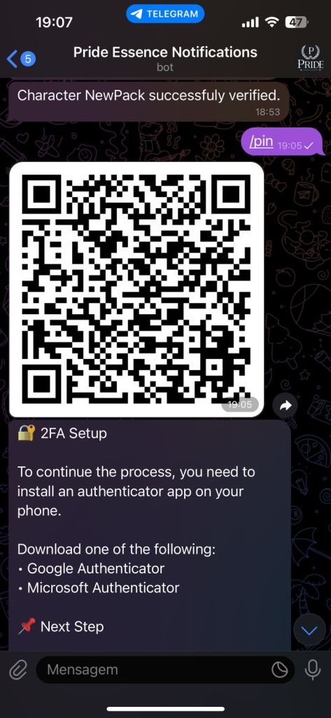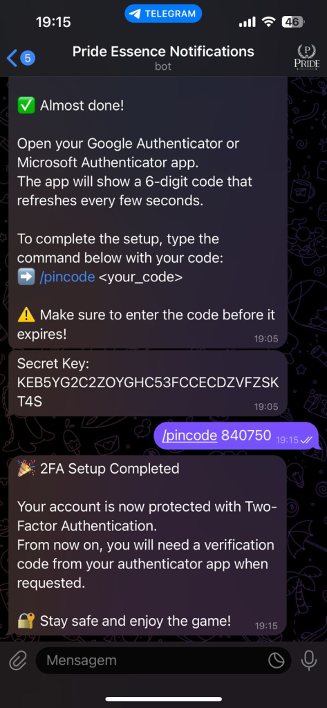 - Now that you have registered your PIN key, go back to Telegram and run the command